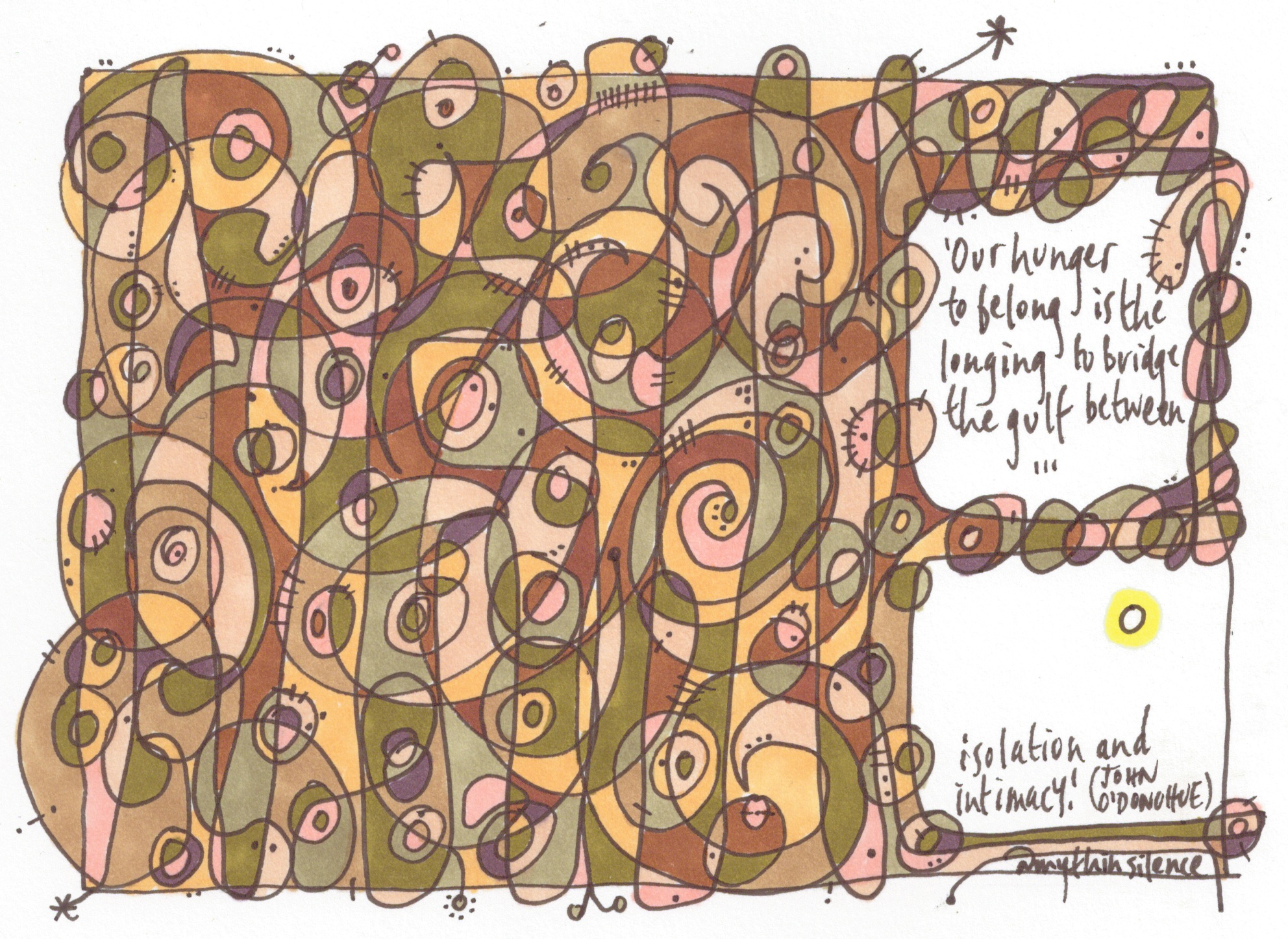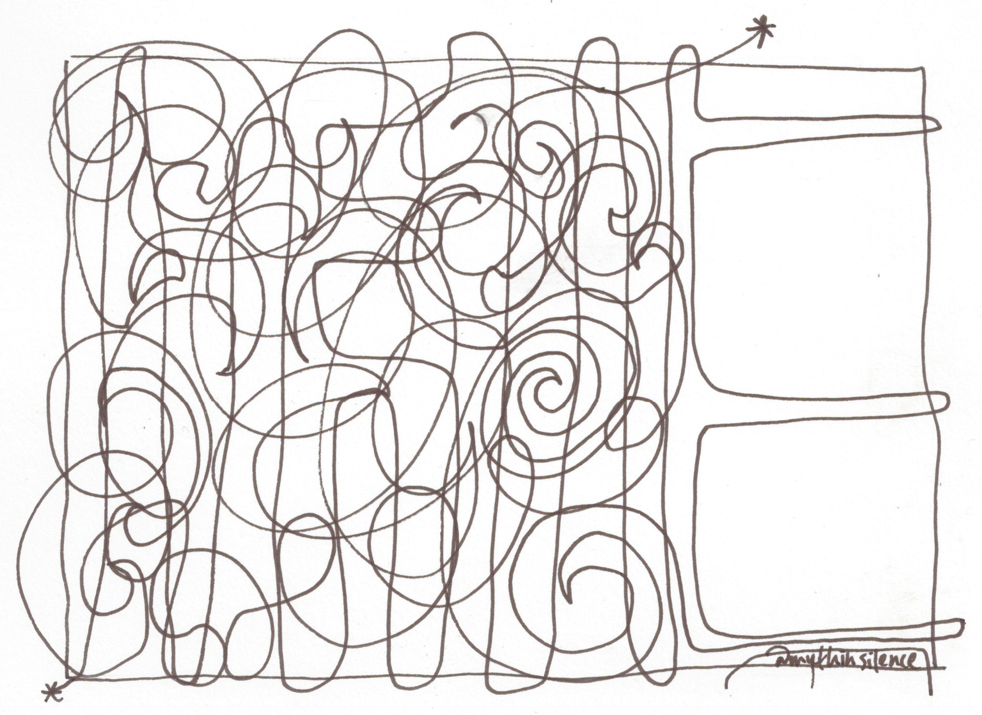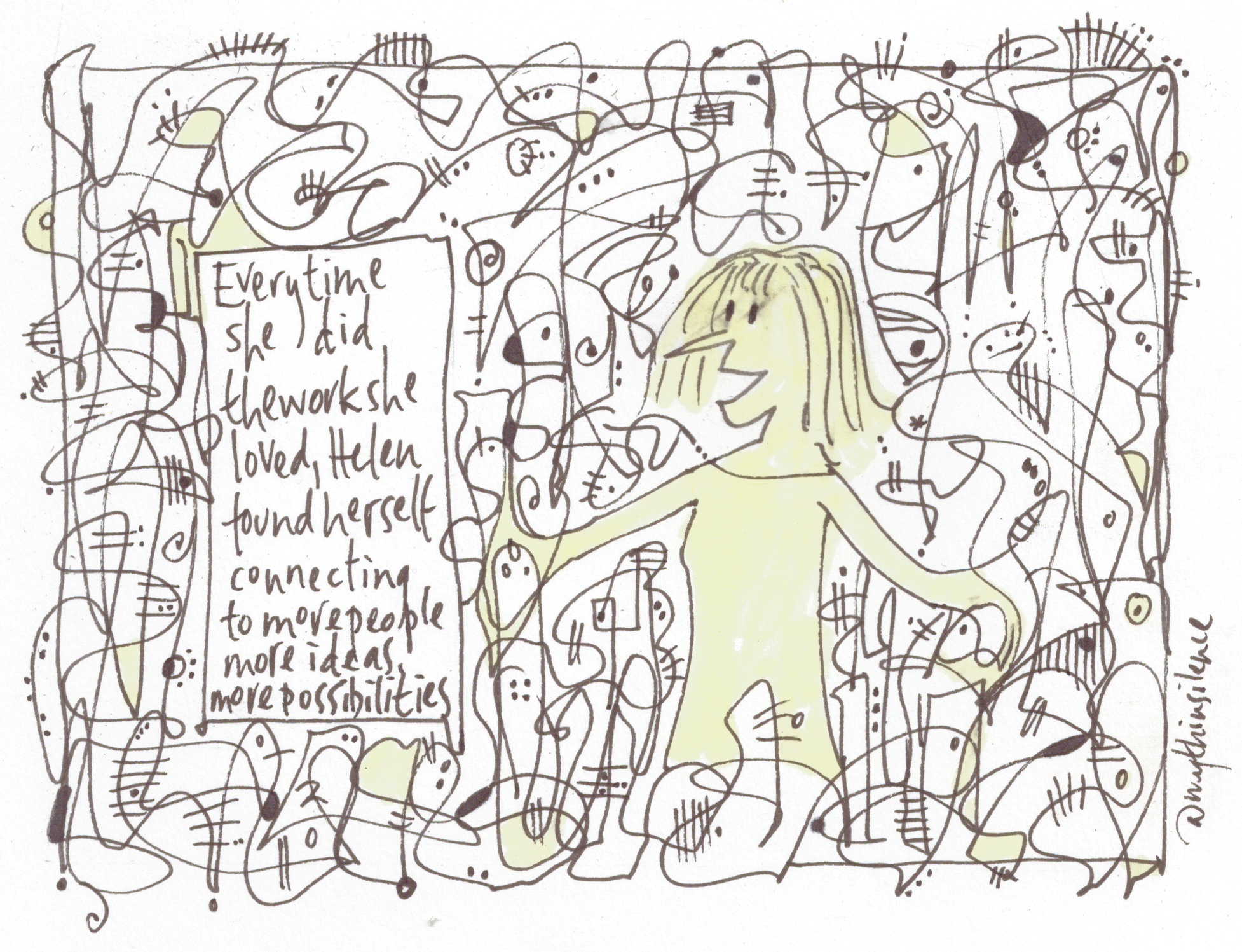 (^A tangental offering from Sunni Brown suggests this doodling exercise: on a sheet of paper, doodle an unbroken line, creating enclosed spaces for just ten seconds – my first stage of today’s cartoon does just this – see below, though, as I write, I haven’t yet doodled it – and colour in the spaces. What you have done, Brown says, is released glucose and oxygen-rich blood into the visual and imaginative parts of the brain – The Doodle Revolution.)