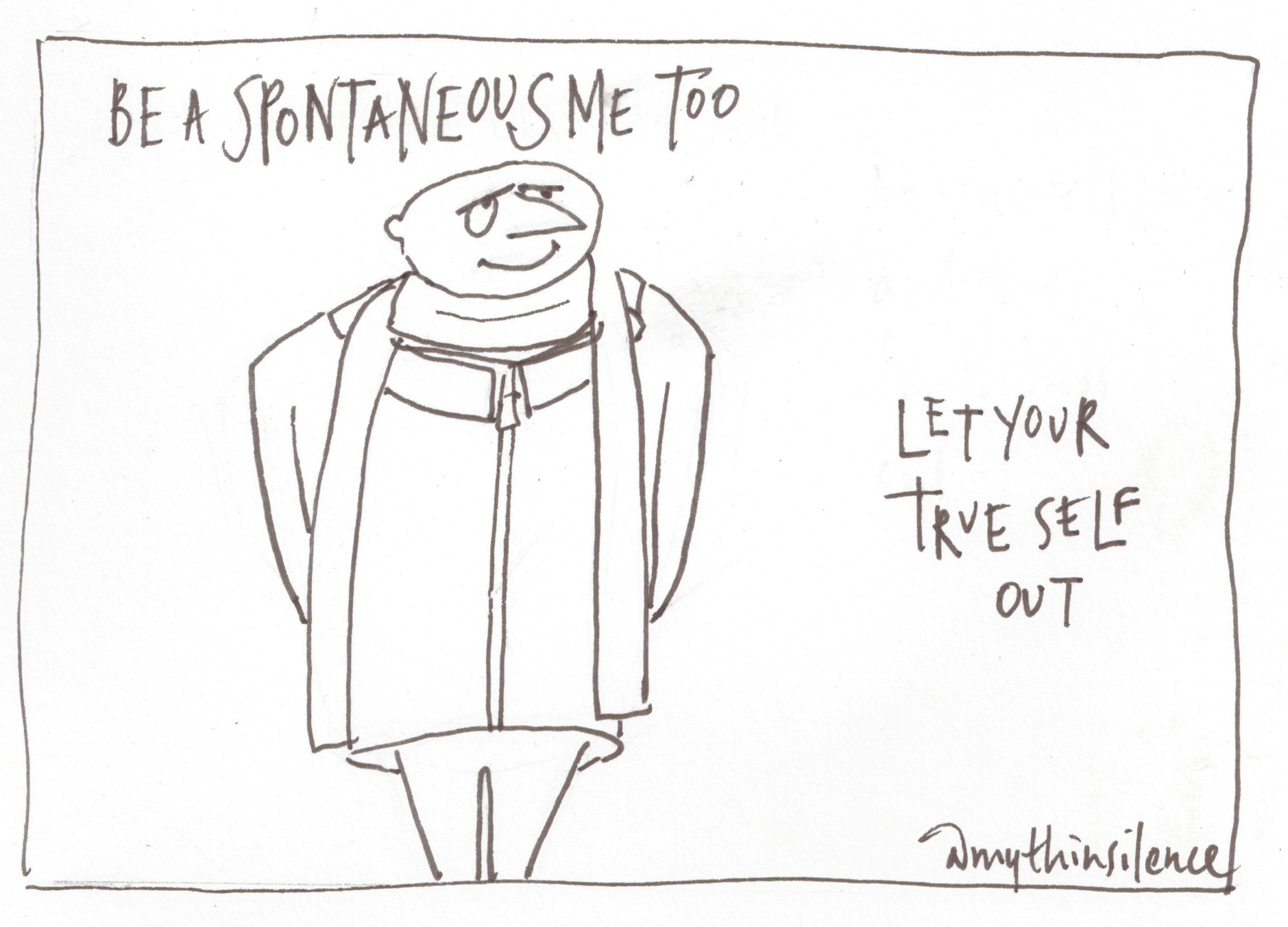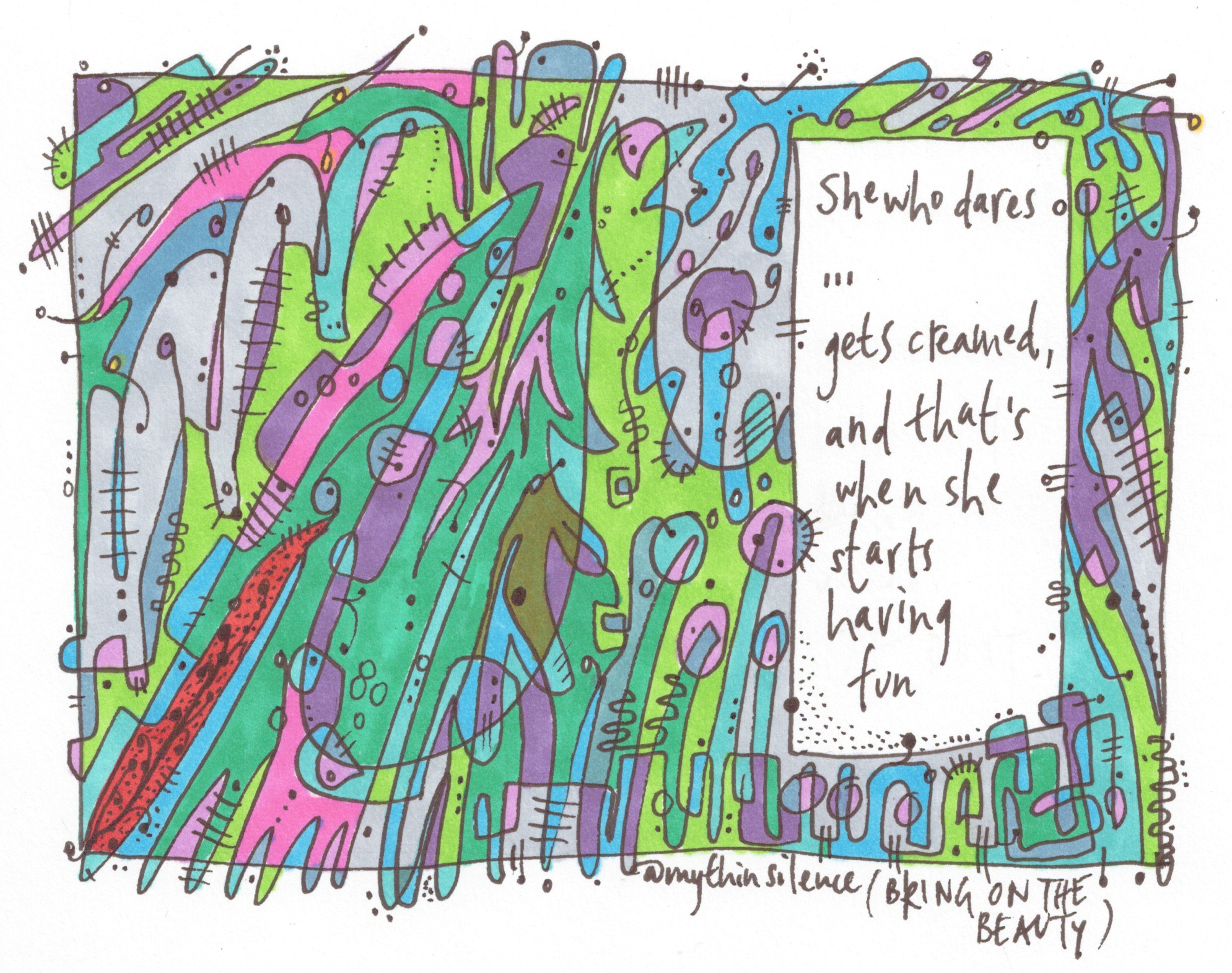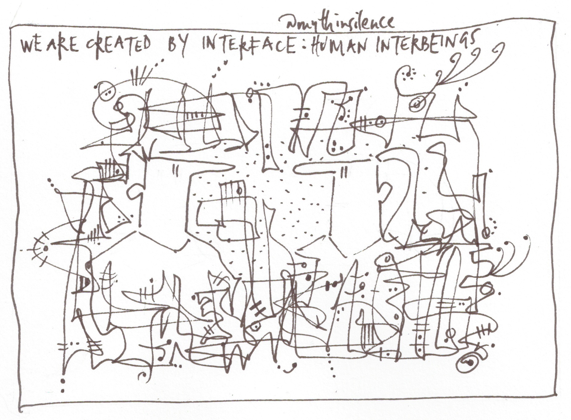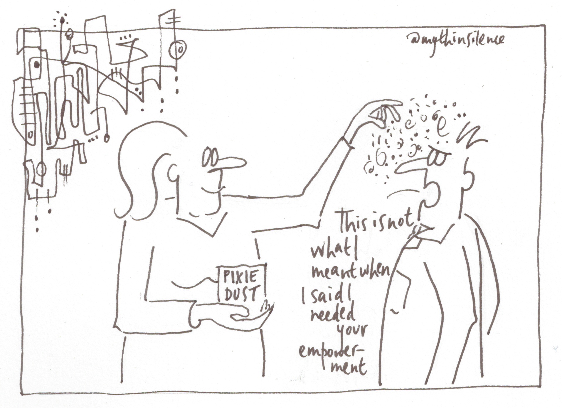 (^A tangental offering from Sunni Brown suggests this doodling exercise: on a sheet of paper, doodle an unbroken line, creating enclosed spaces for just ten seconds – my first stage of today’s cartoon does just this – see below, though, as I write, I haven’t yet doodled it – and colour in the spaces. What you have done, Brown says, is released glucose and oxygen-rich blood into the visual and imaginative parts of the brain – The Doodle Revolution.)