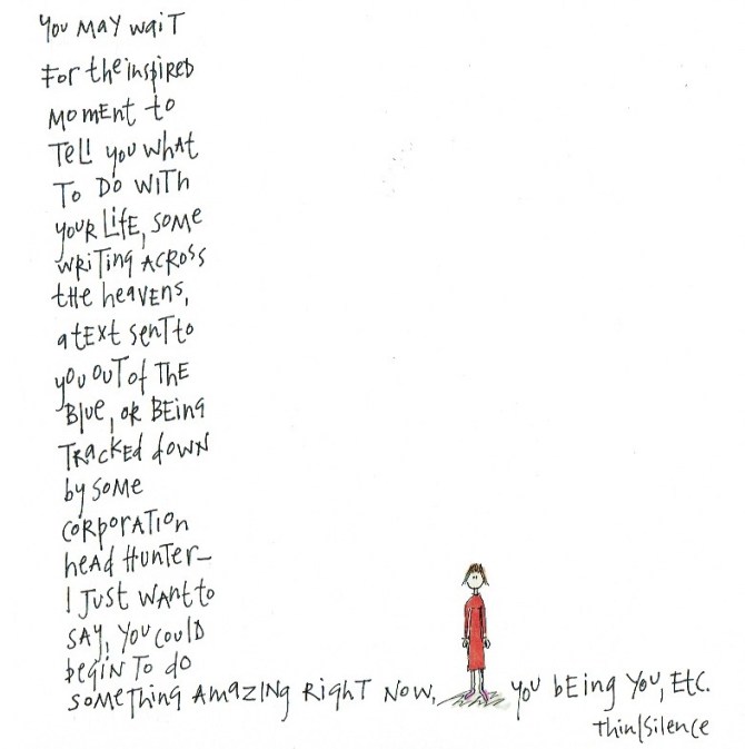 Once upon a time there was a person with an idea. The idea caught on and became wrapped in the designs and productivity of others, and a whole institution was built around it. Many people were employed by the institution. It changed the way society thought about itself, everything was measured by it. Education was designed to point everyone towards it, young people gained the qualifications that made it possible to be employed in the production that developed out of the idea. No one thought they could have an idea that competed with the original idea. They gave up any hope of being able to do something with the idea that once had circled around their thoughts. They didn’t realise that the important part of this story was the experience the one person had at the very beginning. How that person could be any person pursuing their idea. And that person and idea could be them.