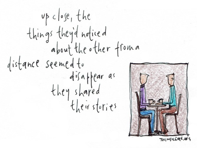 We see many things up close in each other that we could not see from a distance. It’s like noise and signals. There’s a lot of noise but the noise is unimportant,. The signals, though, are what our lives really are, the stories of who we are, how we got here, where we hope to go. We take the risk of being known and knowing because no-one is perfect and at the same time are pretty amazing.