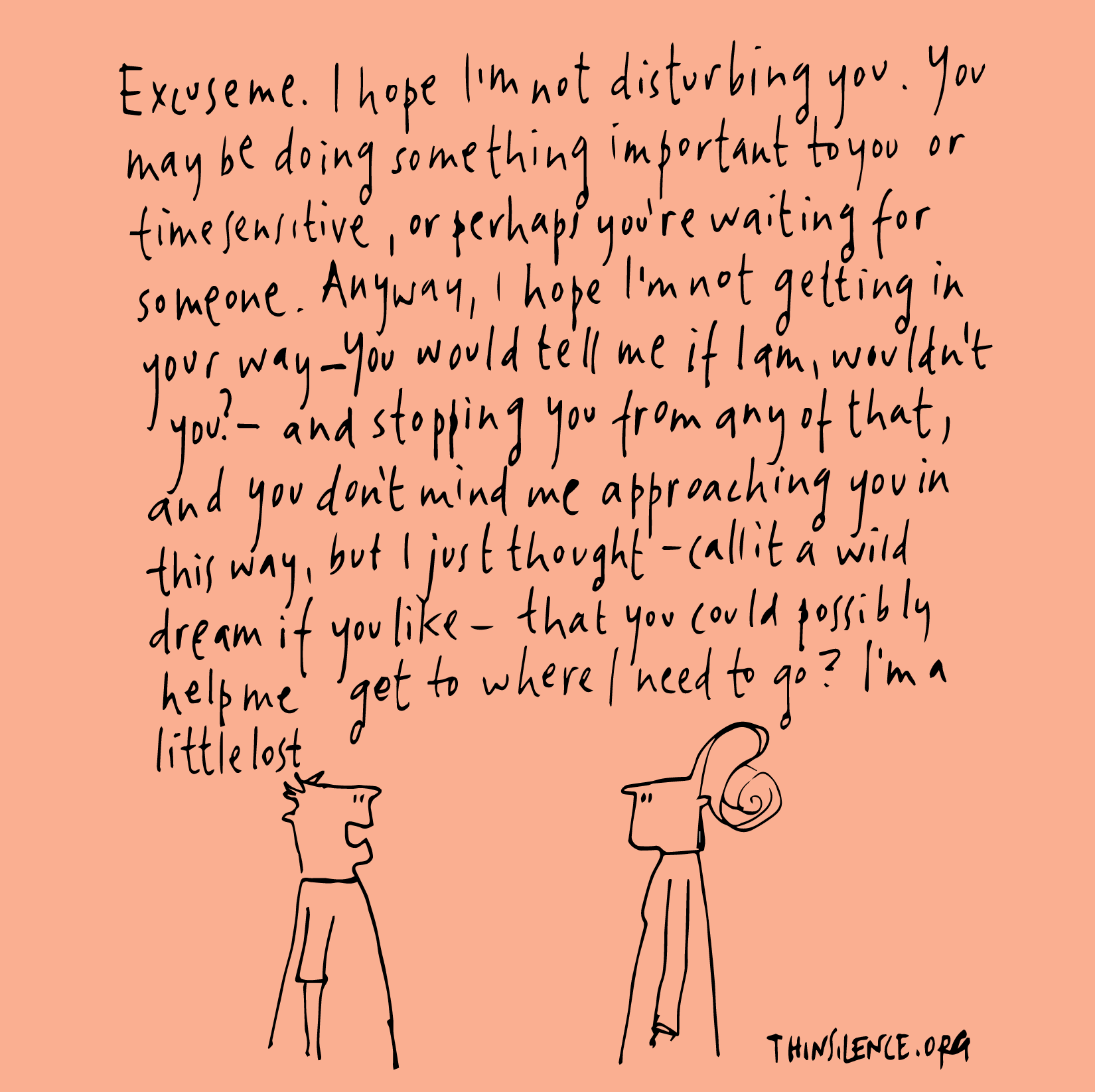 It’s okay to realise that life has a mysterious quality to it, it has an element of uncertainty, it’s okay to realise that we do need help, that calling our for help is a very generous act because it allows others to help us and allows us to be helped. Sometimes we’re calling for help. Sometimes we’re offering help, and then this hostile world becomes a very different place. It is a world where there is help being received and help being given, and in such a world this compelling determined world loses some of its urgency and desperation. It’s not so necessary to be so adamant about the world according to me.^
