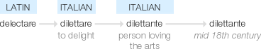 mid 18th century: from Italian, ‘person loving the arts’, from dilettare ‘to delight’, from Latin delectare .
